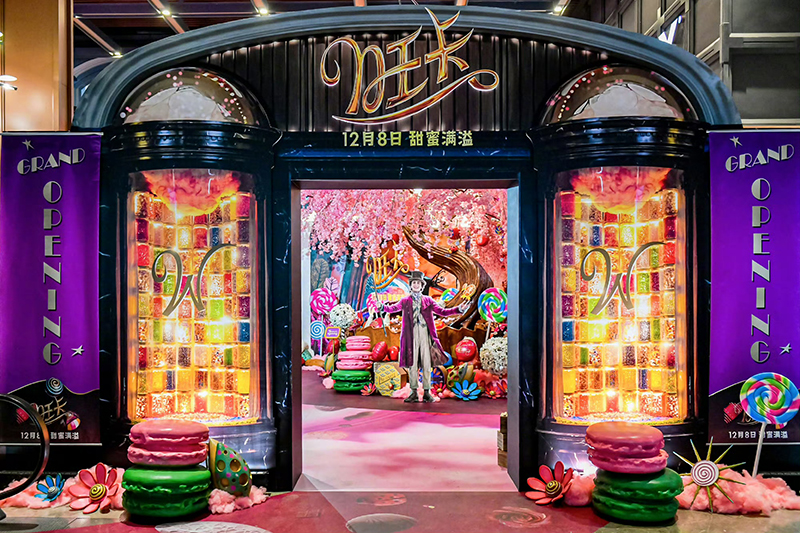 《旺卡》首映禮現(xiàn)場的設(shè)計獨(dú)具巧思,直接將電影中的旺卡巧克力店“搬到”影城。觀眾手持旺卡巧克力店“開業(yè)”邀請函,穿過大門,就步入旺卡巧克力店,正式開啟繽紛奇趣的童話世界,令人一秒忘記所有煩惱。