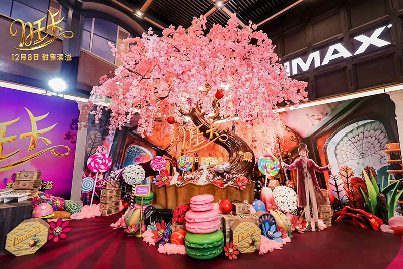 首映現(xiàn)場,最引人注目的當(dāng)屬電影里標(biāo)志性的巧克力櫻花樹。片中,旺卡在粉色櫻花樹下漫灑巧克力糖果,夢幻爛漫,猶如童話仙境。而在首映禮現(xiàn)場,這棵櫻花樹也被完美復(fù)刻,櫻花樹四周堆滿各色巧克力糖果和花朵,令觀眾可以親身走入巧克力“花?!保蔀楫?dāng)天的打卡點(diǎn)。