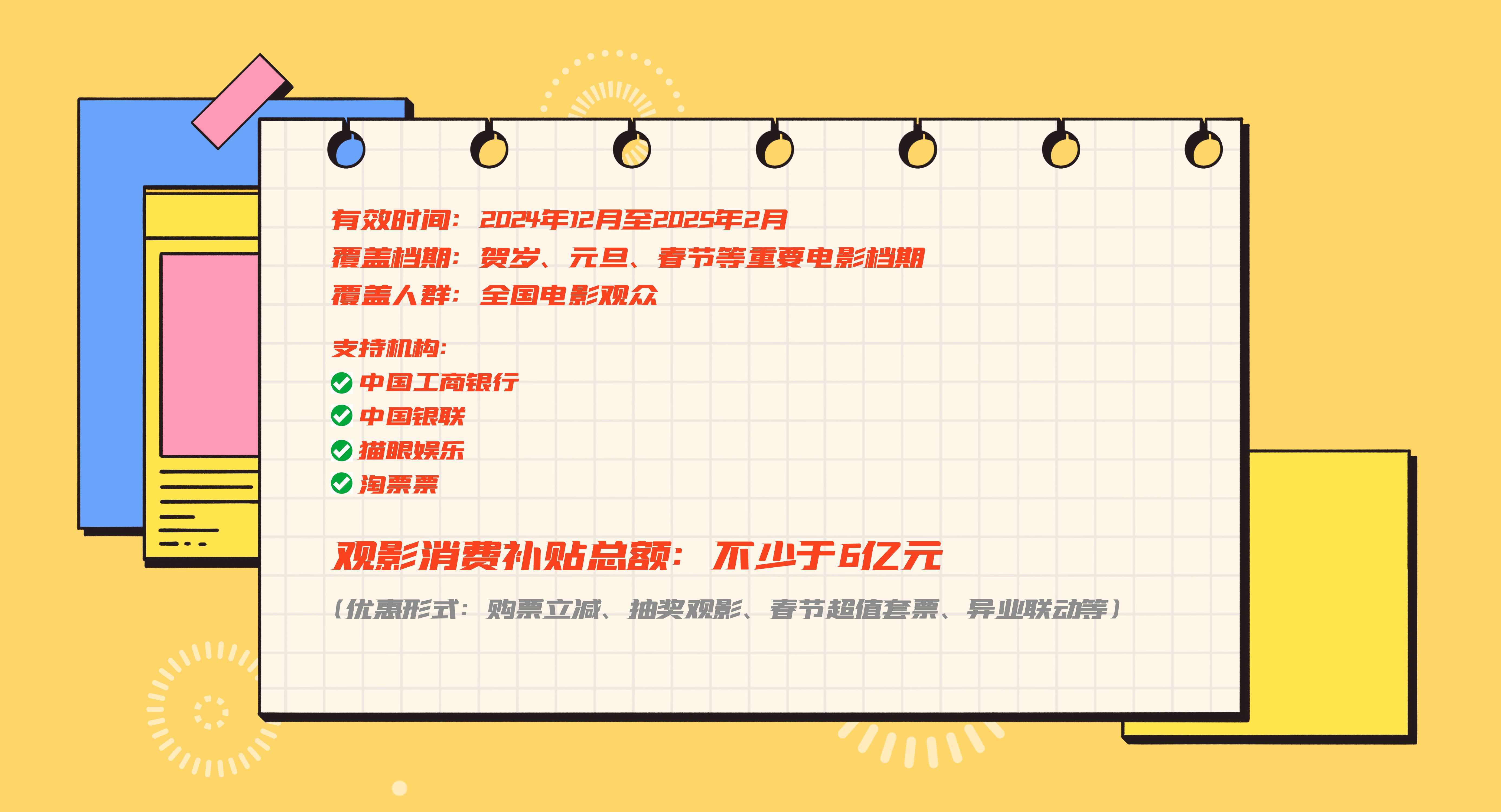 還有個(gè)好消息 觀影消費(fèi)補(bǔ)貼來啦! 去年12月 國(guó)家電影局啟動(dòng)了 “跨年賀歲 喜迎新春——全國(guó)電影惠民消費(fèi)季” 合計(jì)投入不少于6億元觀影消費(fèi)補(bǔ)貼 惠及全國(guó)電影觀眾