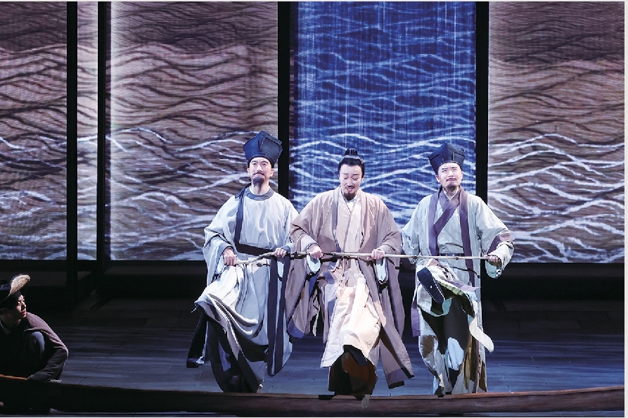 記者:舞臺(tái)上有一場(chǎng)戲堪稱絕妙:一葉扁舟上,蘇軾、王安石、司馬光三人上演的“盜夢(mèng)空間”式“跨越時(shí)空”的對(duì)話,比如處理水患災(zāi)情時(shí),蘇軾要召開新聞發(fā)布會(huì),甚至說(shuō)要開直播……這些看似隨意甚至荒唐的表達(dá)和演繹,給觀眾帶來(lái)一種新鮮的、自由開放的演劇體驗(yàn)觀。劇中有借鑒中國(guó)戲曲中的可變性、流動(dòng)性、空間結(jié)構(gòu),也有借鑒西方戲劇的多種技巧,這樣非線性、開放式敘事結(jié)構(gòu),有著怎樣的匠心?