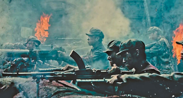 相比于以往表現(xiàn)毛澤東同志革命故事的作品,此次《浴血榮光》在如何表現(xiàn)建軍過程的影像上下了很大功夫。導(dǎo)演陳力做了精心設(shè)計,她讓影像不僅還原歷史,還富有更為深刻的寓意。比如,毛澤東在湖南發(fā)動秋收起義前,前往萍鄉(xiāng)安源煤礦的兵工廠,和工農(nóng)兄弟一起鍛造鐮刀與斧頭等武器,他在畫面的黃金分割點慷慨演說,鋼鐵熔爐里火紅的光芒照射在他身上,充滿油畫般的力量感和造型感,也寓意著人民軍隊就誕生于工農(nóng)中。
