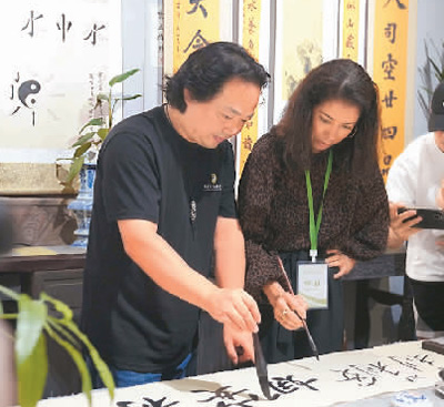 巴西泰坦尼制作有限公司制作人莉莉安娜·羅查·卡瓦薩(右)在廣東珠海北山社區(qū)體驗(yàn)書(shū)法。論壇主辦方供圖