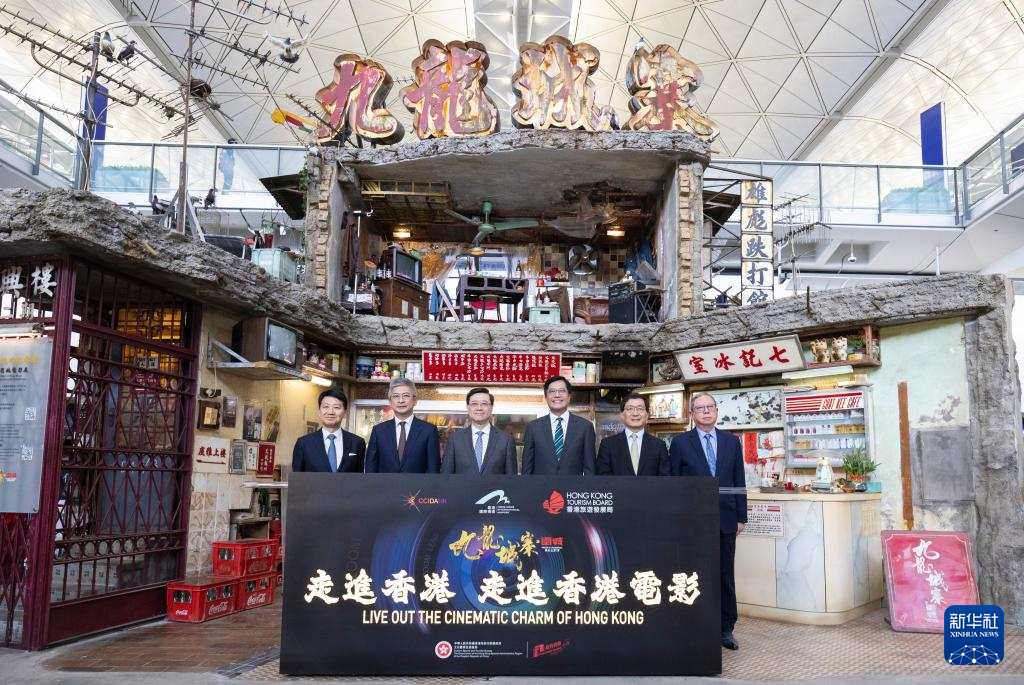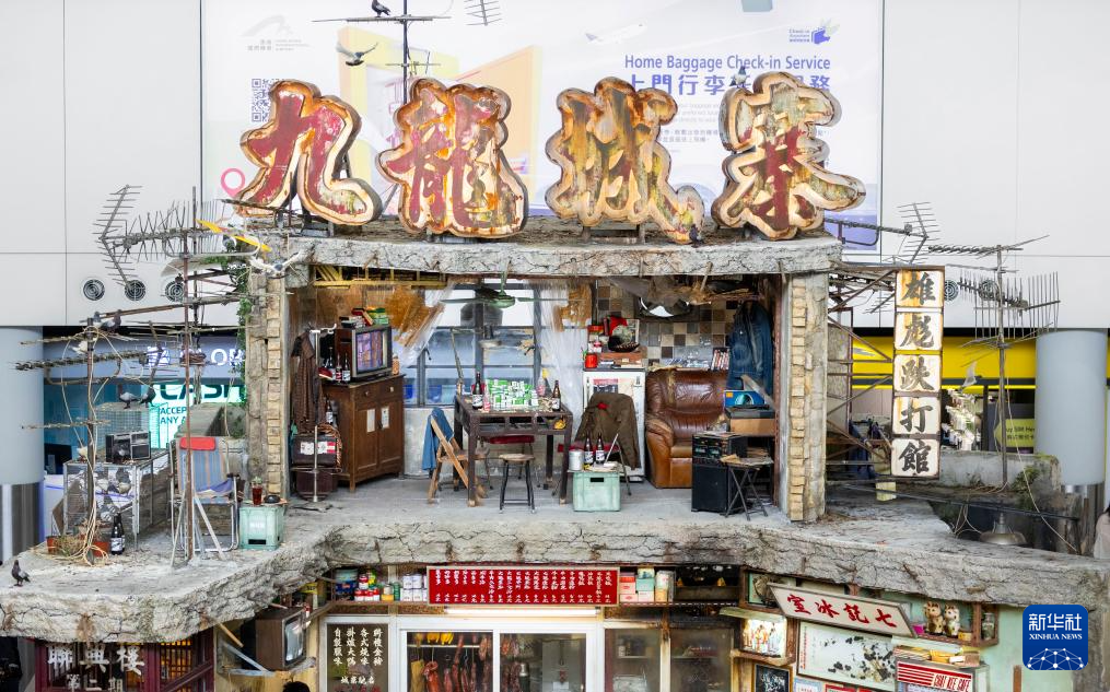 新華社香港10月7日電 香港國際機場接機大廳,一座約6.5米高的雙層舊建筑物屋頂亮著“九龍城寨”霓虹燈牌,吸引許多旅客駐足欣賞。7日,以“走進香港 走進香港電影”為主題的展覽在香港國際機場舉行開幕儀式,電影《九龍城寨之圍城》多個拍攝場景一一重現(xiàn)。