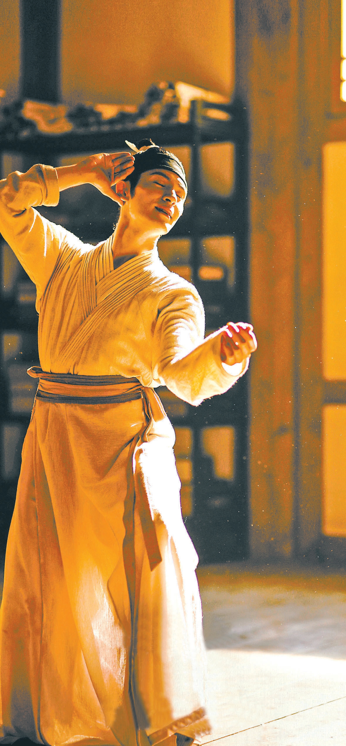 除此之外,《只此青綠》對(duì)舞蹈部分的呈現(xiàn)也十分精彩,用近景和特寫捕捉動(dòng)作細(xì)節(jié),用全景拍攝群舞的整體畫面。故事中情緒激昂的部分,如“問篆”“尋石”“淬墨”三篇,利用傾斜、旋轉(zhuǎn)等特殊景別和運(yùn)鏡來表達(dá)。寫意較多的部分,如“青綠”“入畫”兩篇,用特效輔助畫面,舞者的裙裾在地面上留下青綠墨痕,讓已在畫中靜待千年的色彩瞬間活了起來。此外,高速攝影進(jìn)一步保留了舞者的姿態(tài)和動(dòng)作細(xì)節(jié)??梢哉f,電影版《只此青綠》充分利用銀幕鏡頭的特性,幫助觀眾更好地欣賞、理解舞蹈,也讓整個(gè)故事有了更強(qiáng)的沉浸感。
