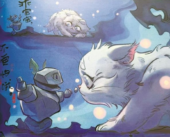 繪本故事中,石磯娘娘住的山里闖進(jìn)了一只小貓咪,魔鏡告訴她高大的樣子可能會(huì)嚇到貓咪,于是她就變成小石頭人的樣子與貓咪成了好朋友(見(jiàn)上圖),她還給小貓咪起名叫“虎子”。有一天她和貓咪玩耍的時(shí)候碰見(jiàn)了一只野獸,為了保護(hù)小貓咪,她恢復(fù)了高大的樣貌嚇跑了野獸,也嚇跑了“虎子”。于是石磯娘娘又變成了孤身一人,直到有天小貓回來(lái),告訴她自己找到了媽媽,真的要離開(kāi)山里了,石磯娘娘則含淚與小貓做了正式的告別。暖心的故事看哭了很多觀眾。
