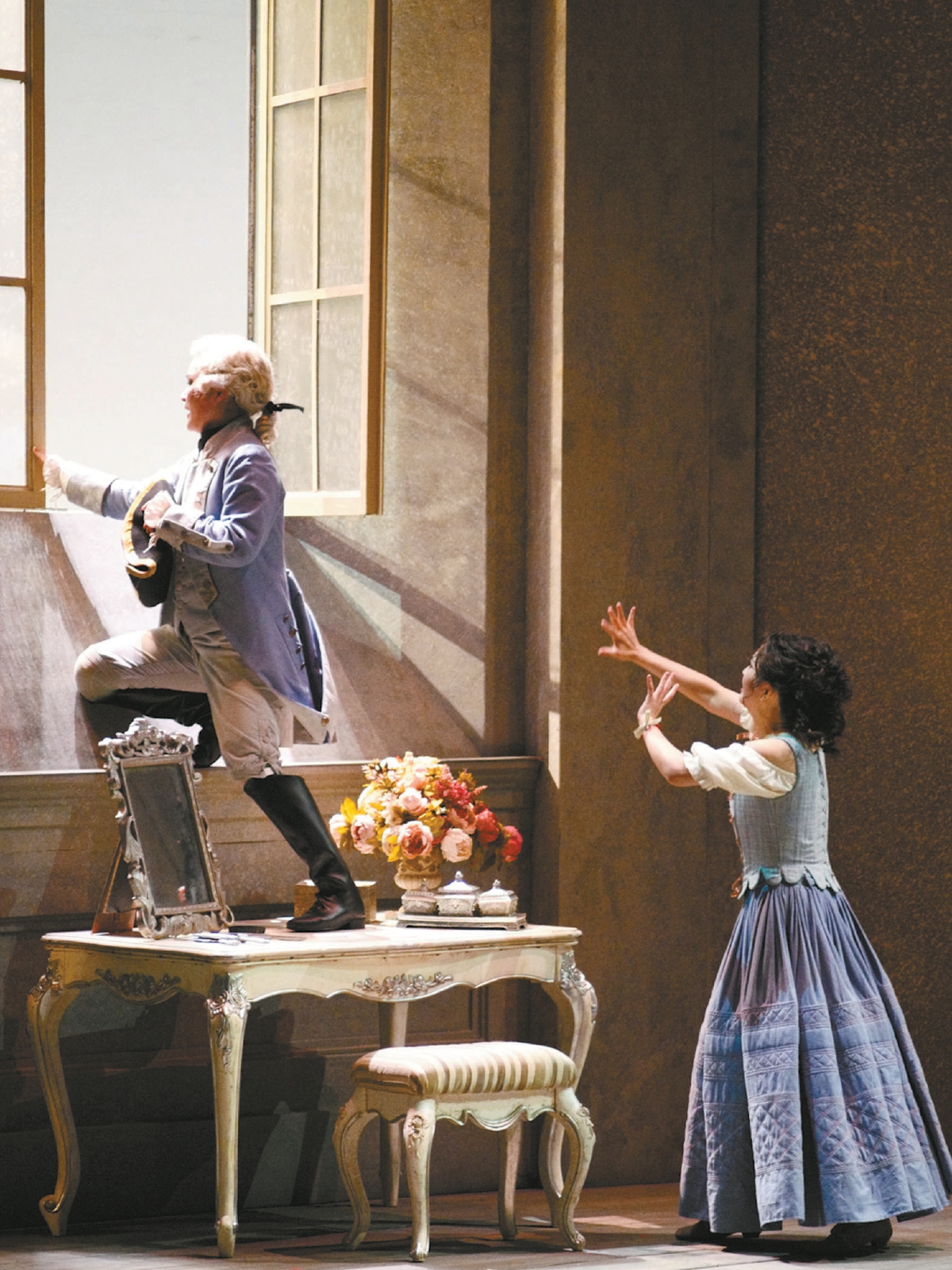 奧地利男中音馬庫斯·維爾巴飾演的費(fèi)加羅一登場(chǎng)便贏得滿堂喝彩。他以渾厚圓潤(rùn)的音色與精湛的表演技巧,將這位機(jī)智勇敢的男仆形象刻畫得入木三分。在詠嘆調(diào)“如果你想跳舞”中,維爾巴與國家大劇院合唱團(tuán)的默契配合將劇情推向首個(gè)高潮,合唱團(tuán)飽滿和諧的和聲為音樂增添了絢麗色彩。第一幕結(jié)尾處,維爾巴演唱的著名詠嘆調(diào)“再不要去做情郎”以明快有力的旋律與溫柔勸導(dǎo)的宣敘調(diào)交替呈現(xiàn),生動(dòng)展現(xiàn)了費(fèi)加羅幽默風(fēng)趣與堅(jiān)定勇敢的雙重性格,鏗鏘有力的演唱贏得全場(chǎng)掌聲雷動(dòng)。