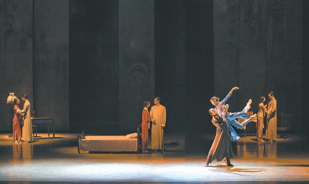 《永不消逝的電波》是韓真、周莉亞這對“舞壇雙子星”較早“出圈”的舞劇,在觀眾心中留下了很多經(jīng)典舞段。十余位身穿旗袍、手持蒲扇的女舞者,在《漁光曲》的旋律中曼妙起舞,浸透老上海風情;與之產(chǎn)生強烈對比的是,披著黑色斗篷的特務在冷雨夜展開驚心動魄的追捕;李俠與蘭芬從假扮夫妻到發(fā)展為真正的愛人,幾對舞者的雙人舞同臺綻放。這些片段時常在舞蹈愛好者腦海中盤旋。