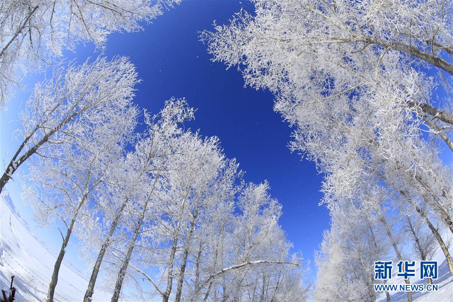 1月3日在新疆阿勒泰地區(qū)富蘊(yùn)縣吐?tīng)柡猷l(xiāng)拍攝的霧凇美景。藍(lán)天映襯下的冰雪世界顯得一片肅穆。 新華社發(fā)(丁寧 攝)