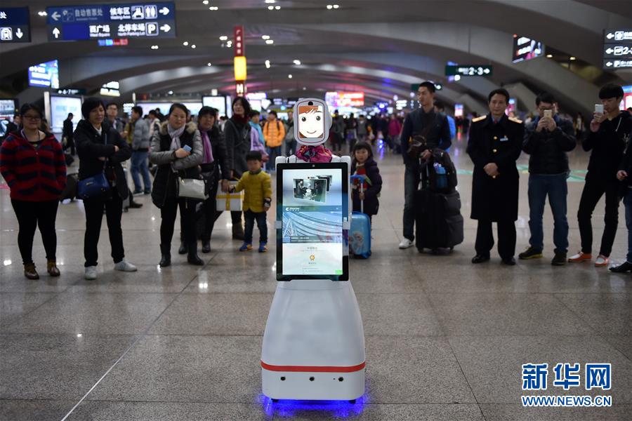 2月1日,旅客們在廣州南站與智能機(jī)器人“小璐”對話。當(dāng)日,一臺名叫“小璐”的智能機(jī)器人亮相廣州南站,吸引了大批旅客的圍觀,大家紛紛嘗試與“小璐”對話,向她咨詢列車時刻、購票信息、天氣情況等問題,“小璐”不僅可以用甜美的女聲一一作答,還可以在接收到語音指令后,為旅客“唱歌”和“跳舞”。據(jù)了解,使用智能機(jī)器人服務(wù)旅客是廣州南站在今年春運(yùn)中的新嘗試,如果試用效果良好,今后有望在車站中看到更多智能機(jī)器人的身影。新華社記者 梁旭 攝