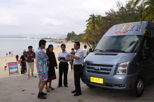 2011年初,三亞市特批專款70多萬元,為旅游巡回法庭配置兩輛巡回審判車,車上設(shè)有國徽、法臺、原被告席、當(dāng)事人座椅,還配備電腦、打印機,能即時制作裁判文書。從此,兩輛可以快立、快裁、快調(diào)、快結(jié)、快執(zhí)的巡回審判車開進了三亞各個景點,真正實現(xiàn)了哪里有旅游投訴和糾紛,巡回審判車就在第一時間趕到哪里。