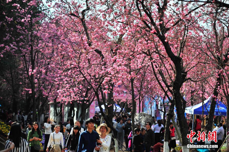近日,昆明圓通山的櫻花和海棠花逐漸進(jìn)入盛花期,引來(lái)眾多市民踏春趕花潮。圓通山工作人員介紹,受此前寒潮的影響,海棠和櫻花花期推遲,但顏色比往年更艷麗且花量增加。中新社記者 劉冉陽(yáng) 攝