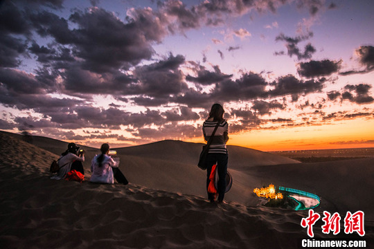 7月中旬,國際旅游名城甘肅敦煌進入旅游旺季,每天成千上萬的海內外游客來到當?shù)刂Q沙山月牙泉景區(qū)觀光游覽,觀賞大漠風光,感受敦煌文化,體驗民俗風情。傍晚時分,西邊的天空被晚霞染紅,美麗的月牙泉被寶藍色的燈光點綴著呈現(xiàn)出美輪美奐的闌珊夜色,大批游人沉浸于如夢如幻的迷人夜色里流連忘返。