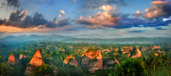 萬佛山地處云貴高原向南嶺山地的過渡地帶。經(jīng)數(shù)以億年的流水、風(fēng)化地質(zhì)作用,逐漸發(fā)育呈現(xiàn)出丹霞赤壁、石嶺、石寨、石柱、石橋、一線天、狹谷、溝巷等奇特的丹霞地貌自然景觀。域內(nèi)丹霞峰林拔地而起,巍巍陣列,尤如一幅天然水墨長卷。登臨萬佛山主峰山頂,俯視峰林,氣勢(shì)磅礴,向西南可望海神龜活神活現(xiàn);向北望毛蠟燭峰、天書巖、夫妻巖形象逼真;向南可遠(yuǎn)眺將軍山主峰及該將軍山景區(qū)螺絲峰和神仙洞景區(qū)大寨巖主峰及神仙山主峰。群峰列陣,萬佛朝宗,不愧為“丹霞群峰第一山”。