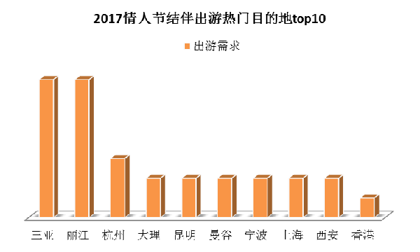 情人節(jié)當天在線結伴出游者的目的地選擇既有國內的也有國外的,比較熱門的目的地主要有:三亞、麗江、杭州、大理、昆明、曼谷、寧波、上海、西安、香港。