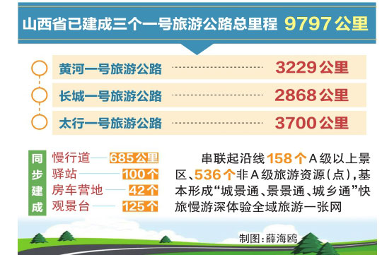 截至今年10月10日,山西省已建成三個(gè)一號(hào)旅游公路總里程9797公里。其中,黃河一號(hào)旅游公路3229公里、長(zhǎng)城一號(hào)旅游公路2868公里、太行一號(hào)旅游公路3700公里,同步建成慢行道685公里、驛站100個(gè)、房車(chē)營(yíng)地42個(gè)、觀景臺(tái)125個(gè),串聯(lián)起沿線158個(gè)A級(jí)以上景區(qū)、536個(gè)非A級(jí)旅游資源(點(diǎn)),基本形成“城景通、景景通、城鄉(xiāng)通”快旅慢游深體驗(yàn)全域旅游一張網(wǎng)。