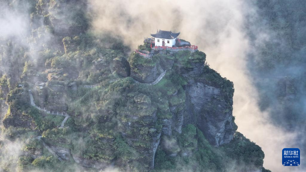 7月15日在貴州梵凈山老金頂拍攝的云霧景觀(無人機照片)。