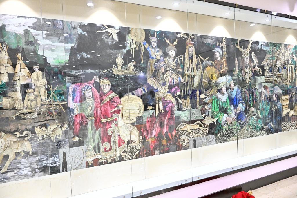 同江市非物質(zhì)文化遺產(chǎn)展示館中描繪赫哲族傳統(tǒng)生活的壁畫。新華社記者 丁赫 攝