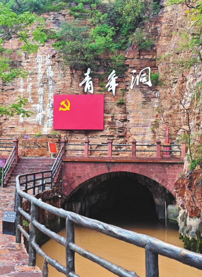 面對干旱缺水的生存困境,林縣人民以“一錘一釬一雙手”苦干十年,削平1250座山頭,鑿?fù)?11個(gè)隧道,在太行山間建成全長1500公里的水利工程,創(chuàng)造了開通“人工天河”的世界奇跡。青年洞是紅旗渠的咽喉所在,攀援在懸崖峭壁之上,縣里挑選了300名青年組成突擊隊(duì),晝夜施工,每人每天只有六兩糧。為了填飽肚子,他們上山挖野菜,下河撈水草充饑,以愚公移山精神挖山不止,經(jīng)過17個(gè)月的苦戰(zhàn),終于鑿?fù)?16米長的隧道。