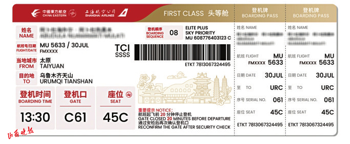 此次升級不僅注重文化表達(dá),更著力提升服務(wù)體驗。登機(jī)牌對登機(jī)口、起飛時間、座位號等關(guān)鍵信息進(jìn)行了“放大提亮”處理,通過字體加粗、色彩對比等設(shè)計,顯著提升了信息辨識度,特別方便老年旅客快速獲取信息,有效降低誤機(jī)風(fēng)險,體現(xiàn)了東航精細(xì)化服務(wù)理念。