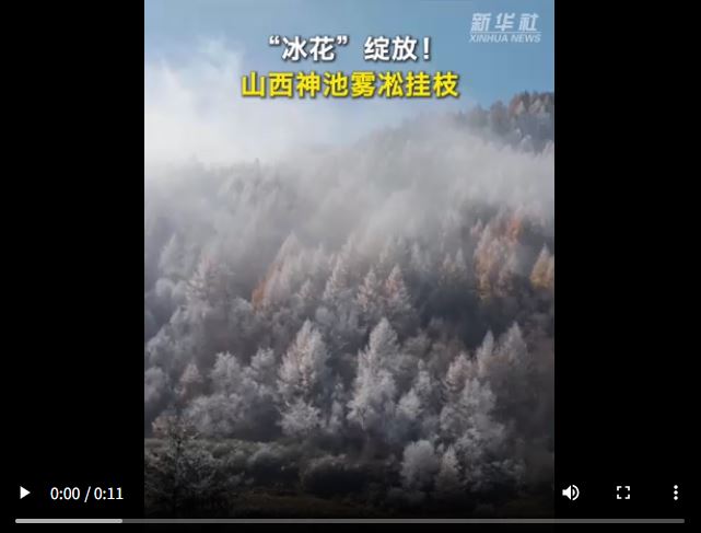 初冬時(shí)節(jié),山西神池國家登山步道出現(xiàn)霧凇景觀。金色的樹枝上掛滿冰晶,微風(fēng)徐來,霧凇輕盈搖曳,還有牛羊在山坡上悠閑地吃草。霧凇宛如一層白色的薄紗,將整個(gè)森林籠罩其間,如夢如幻。