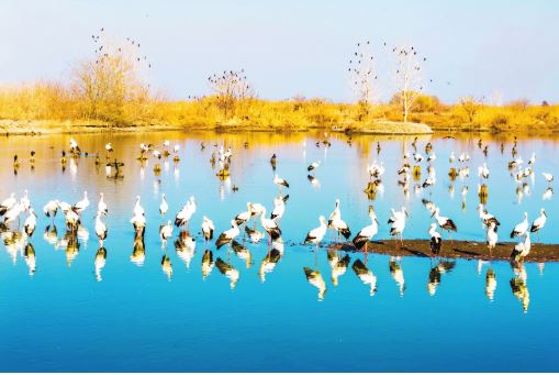 1月10日,鳥兒在江蘇興化里下河國家濕地公園內棲息、覓食。新華社發(fā) 周社根攝