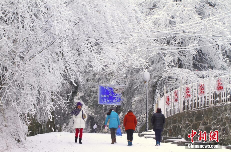 3月10日,受寒潮影響,江西廬山降下2016年入春首場(chǎng)大雪,和霧凇景觀同現(xiàn)。紅色的廬山老別墅房頂,在銀裝素裹的山中格外顯眼。一眼望去,分外妖嬈的廬山猶如仙境畫(huà)卷。圖為一眼望去,銀裝素裹分外妖嬈的廬山猶如仙境畫(huà)卷。 吳健 攝