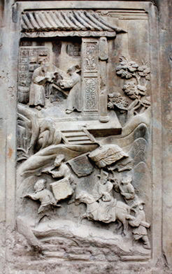 配坊實際上是一座功名石牌坊,上面刊載著武訪疇一家四代人的姓名及朝廷贈封的官爵,咸豐六年(1856)由武訪疇修建。這座石雕牌坊與其它牌坊最大的區(qū)別就是沒有題刻坊名,因此只能稱之為配坊。坐北向南,為四柱三間三樓單檐歇山頂結(jié)構(gòu),牌樓高8米,寬12米,坊體坐落在近1米高的長方形臺基上,立柱仍然采用夾柱石固定。坊頂覆蓋青瓦,正脊飾石雕貔貅裝飾,飛檐翹角,明樓檐下為“圣旨”牌,當(dāng)心間設(shè)兩層小字板,第一層題刻:“贈資政大夫曾祖父廷桂,贈夫人曾祖母李氏;誥贈資政大夫祖父秉壁,誥贈夫人祖母吳氏;誥贈資政大夫父烈,誥封夫人母朱氏。陜西分巡延榆綏兵備道、加四級武訪疇謹(jǐn)建?!钡诙宇}刻“大清咸豐六年歲次丙辰仲夏上院榖旦”。武訪疇借建坊要弘揚祖輩陰德,而祖輩的姓氏大名又不能題刻在母親的節(jié)孝牌坊上,所以,他必須另建一坊才能完整地表達心愿。實際上,這就是建造配坊的真正目的。也正因此在配坊題刻“龍光錫寵”、“鳳詔褒榮”、“克成先志”、“重裕后昆”等。