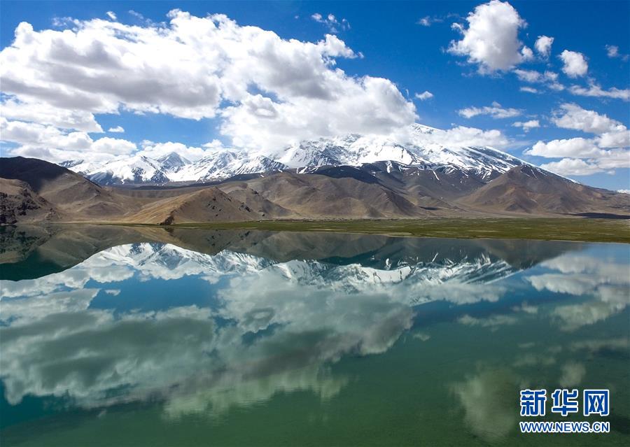 慕士塔格峰倒映在卡拉庫里湖里(6月7日攝)。6月的帕米爾高原風光旖旎,吸引國內外大量游客前來領略它的神韻。 新華社記者 趙戈 攝