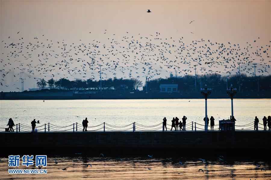 1月10日,水鳥(niǎo)在青島棧橋景區(qū)一帶飛翔。當(dāng)日,山東省青島市天氣晴好,黃昏時(shí)分沿海一帶景色迷人。 新華社發(fā)(王海濱 攝)