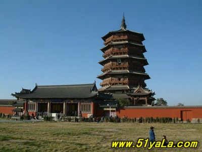 應(yīng)縣木塔佛宮寺釋迦塔位于山西省應(yīng)縣城內(nèi)西北佛宮寺內(nèi)。俗稱(chēng)應(yīng)縣木塔。塔總高67.31米,是我國(guó)現(xiàn)存時(shí)代最早的木結(jié)構(gòu)高層建筑.佛宮寺釋迦塔建于后晉天福年間,遼清寧二年(1056年)重修。 木塔建造在高大臺(tái)基上,臺(tái)基高4米余,分上下兩層。上層的臺(tái)基和月臺(tái)各角,都有角石,從角石上突起的獅子來(lái)看,雕刻風(fēng)格古樸,應(yīng)是遼代的貴物。木塔總高67.31米,其中塔剎高約10米。塔平面八角形,底層直徑30.27米。塔有五個(gè)明層,各層間又夾有暗層,實(shí)為九層。底層為重檐并有回廊,故塔的外觀為六層屋檐。塔的整體比例適當(dāng),其外形也顯得穩(wěn)重而莊嚴(yán)。