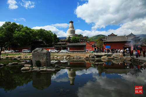 臺(tái)懷鎮(zhèn)鎮(zhèn)北有一小峰,人稱(chēng)靈鷲峰,亦名菩薩頂。所以稱(chēng)之為靈鷲峰,是因?yàn)樗牡乩硇蝿?shì)頗似古印度摩揭陀國(guó)王舍城東北部釋迦牟尼佛說(shuō)法的靈鷲峰故名。據(jù)佛教史籍記載,東漢時(shí)期,我國(guó)佛教最初的傳播人攝摩騰和竺法蘭來(lái)到臺(tái)懷鎮(zhèn),見(jiàn)今菩薩頂?shù)男蝿?shì)頗似印度的靈鷲峰,因而命名之。所以也稱(chēng)靈鷲峰為菩薩頂,佛教徒傳說(shuō)文殊菩薩曾在峰頂顯靈和說(shuō)法。