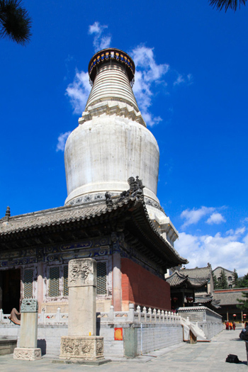 塔全稱為釋迦牟尼舍利塔,俗稱大白塔。塔身?yè)艿囟鹆杩崭呗?,在五臺(tái)山群寺簇?fù)碇骂H為壯觀,人們把它做為五臺(tái)山的標(biāo)志。此塔通高七十五點(diǎn)三米,環(huán)周八十三點(diǎn)三米。塔基為正方形,塔身狀如藻瓶,粗細(xì)相間,方圓搭配,造型優(yōu)美。塔頂蓋銅板八塊成圓形,按乾、坎、艮、震、巽、離、坤、兌等八卦地位安置。塔頂中裝銅頂一枚,高約五米,覆盤二十一米多,飾有垂檐三十六塊,長(zhǎng)兩米多;每塊垂檐底端掛風(fēng)鐘三個(gè),連同塔腰風(fēng)鐘在內(nèi),全塔共有二百五十二個(gè)。風(fēng)歡鈴動(dòng),叮鐺作響。