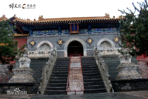 全寺占地四十五畝,順山就勢而筑殿宇,布局嚴謹。寺前有石階一百零八級。山門內(nèi)有天王殿、鐘鼓樓、大雄寶殿等建筑。各殿均用三彩琉璃瓦覆蓋。又,寺內(nèi)有康熙御碑,方座螭首,矗立在前院;乾隆御碑在東禪院碑亭內(nèi),以方形巨石雕成,高六公尺,每面寬一公尺,上刻漢、滿、蒙、藏四種文字。