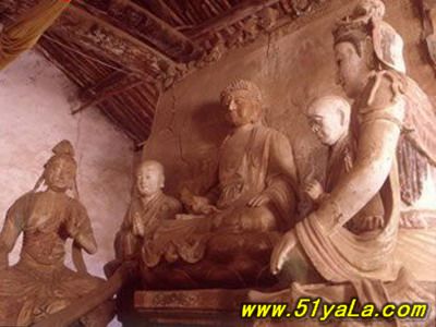 寺前有藏式佛塔一座,高約25米,明代所筑。寺內(nèi)南殿和正殿兩座,均經(jīng)后世修補(bǔ),唯殿內(nèi)塑像和碑刻仍是唐、宋原物。南殿3間,內(nèi)置彩塑12尊,中為釋迦、文殊、普賢、阿難、迦葉,兩側(cè)有觀音、羅漢、韋馱、脅侍、供養(yǎng)人等,造像風(fēng)格與青蓮寺宋代塑像如出一轍。殿內(nèi)《硤石寺大陪遠(yuǎn)法師遺跡記》唐碑一通,寶歷元年(825年)鐫造,碑頭線刻彌勒講經(jīng)圖,山門(mén)、圍廊、佛殿、講壇莫不具備,是研究唐代建筑布局和形制的形象資料。正殿內(nèi)佛壇寬大,上置彩塑7軀,釋迦、文殊、普賢、二弟子及二供養(yǎng)菩薩,皆為唐制,面形豐滿,肌肉健美,身式微屈,姿態(tài)自然。