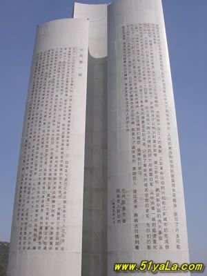 高40公尺的主碑 ,形如一把鋒利的刺刀 。主碑的三個(gè)面上,分別鐫刻著彭真、徐向前、薄一波的題詞。彭真的題詞是“戰(zhàn)績輝煌,永垂史冊”;徐向前的題詞是“參加百團(tuán)大戰(zhàn)的烈士們永垂不朽”;薄—波的題詞是“百團(tuán)大戰(zhàn),抗日戰(zhàn)爭中最光輝的一頁,必將載諸史冊,永放光芒。”