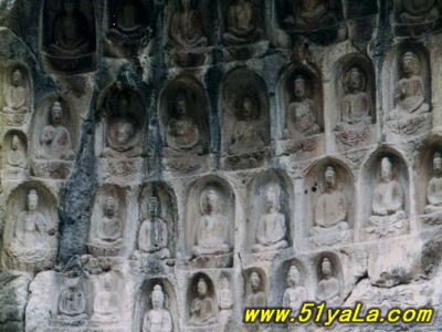 千佛崖在山西霍縣南7.5公里郭莊村山腰。山巒聳峙,山花爛漫,摩崖造像隱現(xiàn)其間。始刻于唐代,宋、元時屢有造鑿,直至明正德五年(1501年)始結束。本尊大佛高約8米,下部刻有唐貞觀以及天寶五年(公元746年)、長慶二年(822年)等題記。千手千眼觀音像高約2米,為元代所造。其余小佛多為三軀一組(一佛二菩薩或一佛二弟子),亦有單佛一龕者,刻工精湛,造型生動,極富民間特色。