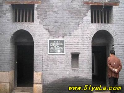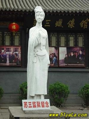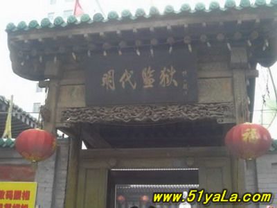 “蘇三監(jiān)獄”在今洪洞縣政府院內(nèi)西南,亦即明洪洞縣衙西南角。一進(jìn)掛有“明代監(jiān)獄”匾額的大門,首先看到的便是蘇三的塑像,外院當(dāng)年監(jiān)獄的辦公場(chǎng)所,右邊的院落是普通監(jiān)牢,中間是過道,兩邊共有監(jiān)牢十余間,過道頂上布有鐵絲網(wǎng),網(wǎng)上掛有銅鈴,一有犯人企圖越墻逃跑,便會(huì)觸響銅鈴。過道的盡頭,正對(duì)的是獄卒的值班室,右面的墻上有獄神的供位,傳說(shuō)當(dāng)年囚犯入獄都要參拜獄神,就是獄神下面的墻基處,有一小洞,是當(dāng)年運(yùn)送尸體的出口,犯人在獄中病死或是被打死,是不能從大門抬出去的,只能從這個(gè)小洞拉出去。過道盡頭的左邊,便是死囚牢的大門,死囚牢雙門雙墻,門上畫有狴犴,狴犴是龍的兒子,長(zhǎng)得卻象老虎,因此人們誤稱為“虎頭牢”,大約是因?yàn)辇埳抛?,子子不同,狴犴專門掌管刑獄,大門只有一米六高,所有進(jìn)入死囚牢的人都要在狴犴像前低頭,顯示對(duì)法律的敬畏。進(jìn)了門洞,里面還有一道門,而這兩道門卻是一扇從右開,一扇從左開,不明就里的囚犯如果越獄,往往出了第一道門卻怎么也打不開第二道門,一個(gè)小小的改動(dòng)就能起到拖延犯人越獄時(shí)間的作用,不能不佩服古人的智慧。進(jìn)入死牢院,右面是一堵高墻,左面就是當(dāng)年關(guān)押蘇三的牢房,里面有蘇三的塑像。死囚院的中央還有當(dāng)年蘇三坐監(jiān)時(shí)洗衣的水井和石槽,井口留有一道道繩索磨下的印記,井口只有半尺多寬,這是為了防止死囚投井自殺。據(jù)說(shuō),右面的高墻里灌裝的都是流沙,如果犯人想要挖墻越獄,流沙便會(huì)從挖開的小口中源源不斷地流來(lái),使其難以挖通圍墻。1964年我國(guó)著名考古學(xué)家王冶秋先生曾在洪洞考察確認(rèn),蘇三監(jiān)獄為我國(guó)罕見的明代監(jiān)獄,并題詩(shī)曰:“虎頭牢里羈紅妝,一曲攪亂臭水漿。王三公子今何在?此處空留丈八墻。”十年動(dòng)亂期間,蘇三監(jiān)獄被拆毀。為了使“蘇三監(jiān)獄”這一僅存的明代監(jiān)獄得以保留,洪洞縣人民政府后做出了修復(fù)“明代蘇三監(jiān)獄”的決定。修復(fù)事宜于1984年5月開始,同年10月竣工。