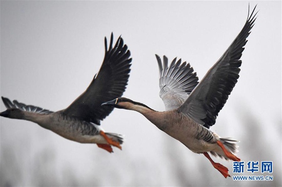 11月29日,候鳥在江西鄱陽湖南磯濕地國家級自然保護(hù)區(qū)飛翔。近日,大批南遷候鳥飛抵鄱陽湖棲息越冬。