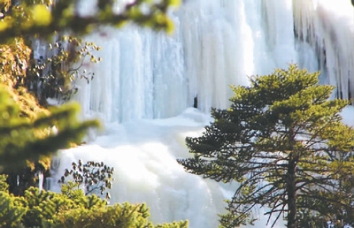 在著名的三疊泉瀑布前,原本飛流直下三千尺的壯觀場(chǎng)面不見(jiàn)了,呈現(xiàn)在游客眼前的是一條巨大的玉帶倒掛在崖壁上。險(xiǎn)峻的石巖上,已是懸崖百丈冰,不少參差不齊的冰凌懸掛在石巖上,往日桀驁不馴的瀑布此時(shí)變得溫馴了。整個(gè)山澗白茫茫一片,被晶瑩剔透的冰柱所覆蓋,銀裝素裹,氣勢(shì)恢宏,場(chǎng)面極為壯觀。此時(shí)雖聽(tīng)不到往昔轟隆隆的瀑布聲,但能一睹這懸掛在石崖上的冰瀑,卻是別有一番景致。