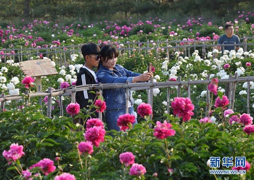 6月2日,游客在和林格爾縣南山旅游景區(qū)觀賞芍藥花。當日,2018內蒙古和林格爾第九屆芍藥文化旅游節(jié)在和林格爾南山旅游景區(qū)開幕。景區(qū)內數(shù)百畝芍藥花競相綻放,吸引眾多游客前來觀賞。新華社記者 鄒予 攝