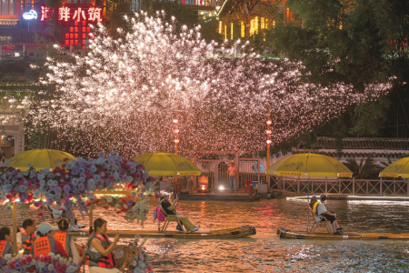7月9日,游客乘坐“龍游貢水”竹筏在貢水河上觀賞打鐵花表演。位于湖北省恩施土家族苗族自治州的宣恩縣城是一座“景城一體·主客共享”的國(guó)家4A級(jí)景區(qū)。近年來,當(dāng)?shù)夭粩嗤脐惓鲂碌摹褒堄呜曀敝穹ぁ跖翊润w驗(yàn)和觀賞項(xiàng)目,讓游客在璀璨燈火中沉浸式感受山區(qū)小城的夜色魅力。