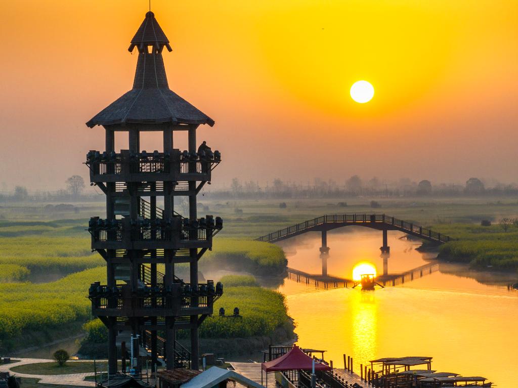 ??2025年4月8日拍攝的江蘇省興化市千垛景區(qū)日出晨景(無人機照片)。新華社發(fā)(周社根 攝) 蜻蜓點水 蛙鳴蟬噪 靈動的“水鄉(xiāng)交響” 讓或騎行或漫步的游客沉醉不已 盛夏時的暑氣 消解在里下河國家濕地公園的萬畝荷塘中