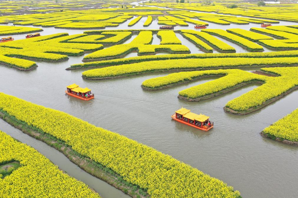 ??2023年3月29日,游客乘坐畫舫欣賞千垛菜花風景區(qū)兩岸油菜花(無人機照片)。新華社記者 毛俊 攝