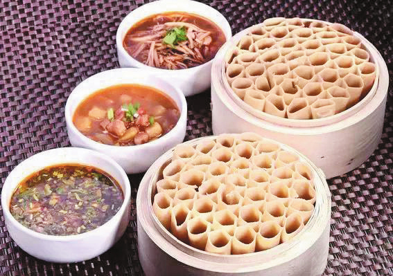 莜面栲栳栳。莜面栲栳栳又叫“莜面窩窩”,是過(guò)去老百姓農(nóng)忙時(shí)節(jié)為省事普遍愛(ài)做的一種飯食。它工藝講究,成形美觀,口感筋道,再加上“羊肉臊子臺(tái)蘑湯”,真可謂“一家吃著十家香”,難怪就連康熙皇帝朝拜五臺(tái)山時(shí),也以品此為人生快事。其做法是:和面時(shí)加以燒開(kāi)的水,用筷子攪拌成面絮,趁熱將其揉成光滑的面團(tuán);取一小塊放在光滑的面板上,用手掌使巧勁一搓,然后撕起來(lái)往食指上繞,卷成中間空的小卷,豎在蒸籠里;最后放在沸水鍋上蒸10分鐘即熟,蒸時(shí)要注意火候,火候不到會(huì)不熟,蒸得過(guò)火則軟癱立不起來(lái),吃時(shí)味欠色減。