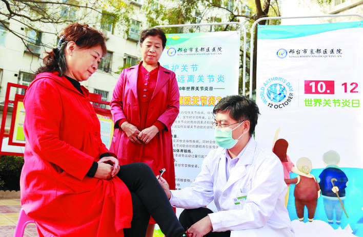 10月12日是世界關(guān)節(jié)炎日,河北省邢臺市襄都區(qū)醫(yī)院醫(yī)護(hù)人員走進(jìn)社區(qū),開展“愛護(hù)關(guān)節(jié),遠(yuǎn)離關(guān)節(jié)炎”義診活動,為居民解答關(guān)節(jié)疾病方面問題,向居民普及關(guān)節(jié)健康知識。 新華社發(fā)(張馳 攝)