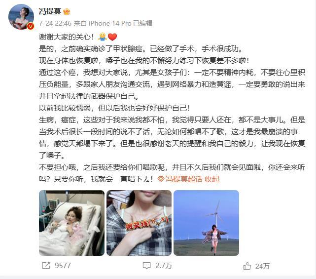 前不久,歌手馮提莫在微博發(fā)文稱自己患甲狀腺癌,經(jīng)手術(shù)已恢復。她說,通過這個癌,想對大家說,尤其是女孩子們,一定不要精神內(nèi)耗,不要往心里積壓負能量。