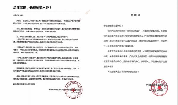 目前,還有多家餐飲公司回應(yīng)。9月7日,廣州多滿分食品有限公司發(fā)聲明稱,學(xué)生餐均是就餐當(dāng)天上午在央廚新鮮現(xiàn)場制作完成的。