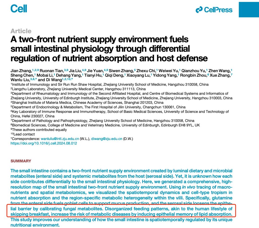 日前,浙江大學醫(yī)學院附屬邵逸夫醫(yī)院、浙江大學愛丁堡大學聯(lián)合學院、中國科學院上海藥物研究所的研究團隊,在頂尖學術期刊《細胞》(Cell)上合作發(fā)表一篇論文表明,不吃早餐的這種飲食習慣會改變小腸對營養(yǎng)物質的吸收方式,從而會增加代謝性疾病的風險。