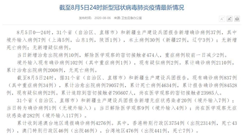 人民網(wǎng)北京8月6日電(董童)國(guó)家衛(wèi)生健康委于今日在官網(wǎng)發(fā)布的《截至8月5日24時(shí)新型冠狀病毒肺炎疫情最新情況》(以下簡(jiǎn)稱“情況”)提出,8月5日0—24時(shí),31個(gè)省(自治區(qū)、直轄市)和新疆生產(chǎn)建設(shè)兵團(tuán)報(bào)告新增確診病例37例,其中境外輸入病例7例(上海5例,山東1例,陜西1例),本土病例30例(新疆27例,遼寧3例);無新增死亡病例;無新增疑似病例。當(dāng)日新增治愈出院病例10例,解除醫(yī)學(xué)觀察的密切接觸者474人,重癥病例較前一日減少2例。