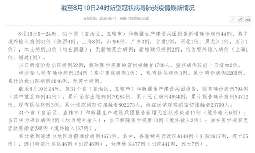 人民網(wǎng)北京8月11日電(董童)國家衛(wèi)生健康于今日在官網(wǎng)發(fā)布的《截至8月10日24時新型冠狀病毒肺炎疫情最新情況》(以下簡稱“情況”)提出,8月10日0—24時,31個?。ㄗ灾螀^(qū)、直轄市)和新疆生產建設兵團報告新增確診病例44例,其中境外輸入病例31例(陜西9例,上海8例,山東6例,廣東3例,甘肅2例,河北1例,黑龍江1例,浙江1例),本土病例13例(均在新疆);無新增死亡病例;新增疑似病例2例,均為境外輸入病例(上海1例,福建1例)。當日新增治愈出院病例52例,解除醫(yī)學觀察的密切接觸者1729人,重癥病例較前一日增加3例。